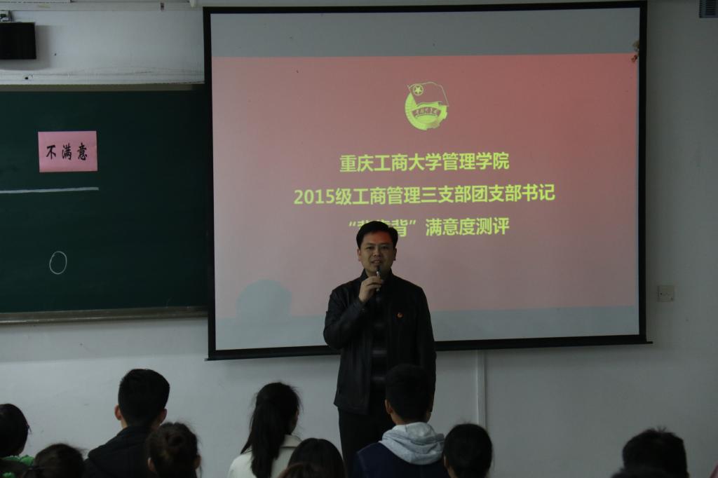 为进一步加强团支部书记队伍建设,掌握团员思想动态,深化“团支部书记工作满不满意团员说了算”的评价机制,3月16日上午11:00,对重庆工商大学管理学院2015级工商管理三支部团支书邱珂同学“背靠背”满意度的现场集中测评在我校南岸校区博智楼07122准时举行。共青团重庆市委副书记、党组织成员黄永宜,共青团重庆市委组织部部长杨春渝,共青团重庆市委高校工作部部长张斐,重庆市各大高校校团委负责人,重庆工商大学校团委、各学院分团委代表及团支书代表到场观摩此次测评。团市委也会将本次测评的全过程拍摄制作成专题纪录片分发到各大高校团支部进行学习。