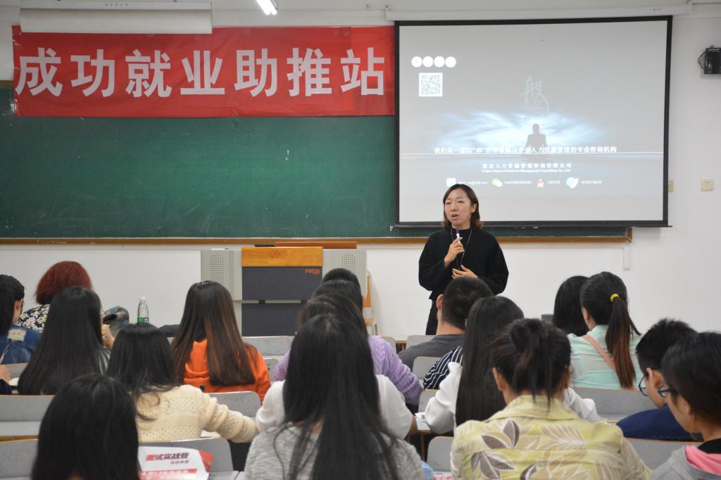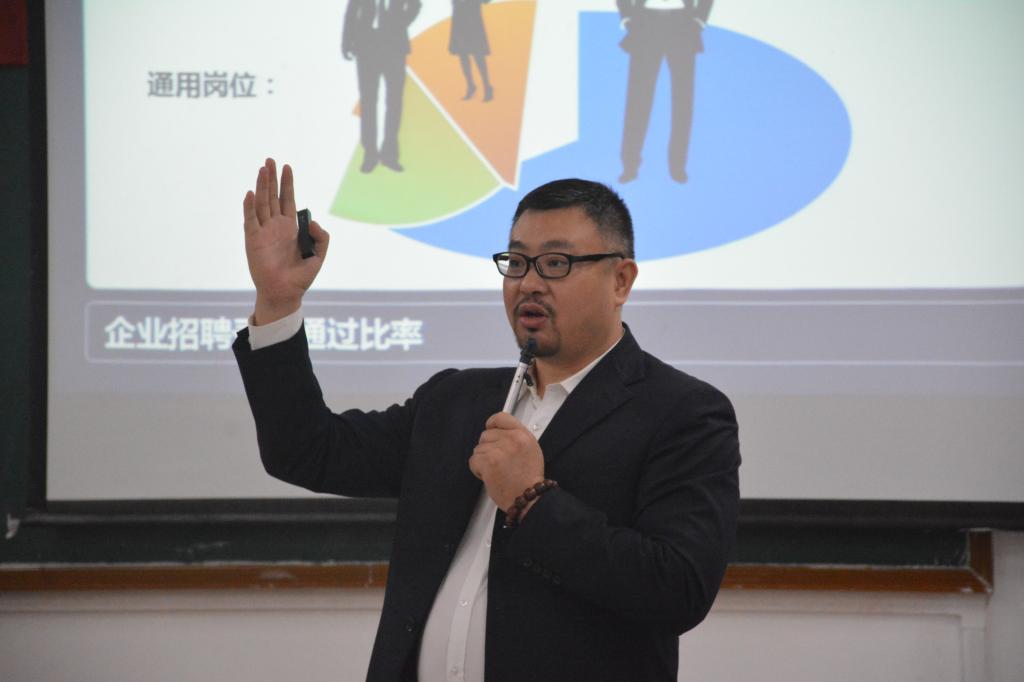 谢照辉先生现任中国人力资源研究会特聘专家,中国HR经理人杂志特约撰稿人,拥有20多年工作经验。本次活动对于现阶段面临求职巨大压力的同学无疑是一次交流学习的好机会。谢先生从“只要有梦,一切皆有可能”谈起,希望同学们能够有目标,做好面临就业压力的准备,自信表现自己争取话语权。在高校毕业生预计750万人的今天,若想脱颖而出,就要跳出自己的限制思维去做一番事业。谢先生希望同学们能够“定其心、降其心、升其心”,在求职路上走得更加顺畅。