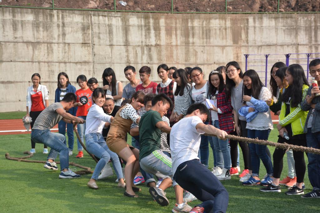 经历了小雨后的北区操场阳光正好,惠风和畅,从江北校区赶来主校的15级干事们也激情饱满,斗志昂扬。本次活动分为蜈蚣赛跑、五人六组、暧昧接力、疯狂指压板和夹弹珠,选出前六名参加最后的拔河决赛。活动伊始,分团委学生会体育部以男干事居多的压倒性优势在五人六组的热身赛中就取得了爆发性的成绩,整齐而响亮的“一二!一二!一二!”的口号让观赛观众都不由自主的赞叹。在其他的游戏环节,各个部门都彰显了积极的参赛热情和高昂的战斗力,暧昧接力时的默契,疯狂指压板时的坚强和夹弹珠时的沉静,每一次胜利都伴随着参赛者的喜悦和同伴们的欢呼。