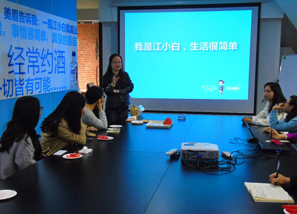 随后,同学们走进了文艺吧的会议室。在助理协助下,宋妮女士为同学们做了简短的宣讲,宣讲的内容主要是江小白的企业文化。她说道:“创建一个卓越的团队,需要吸纳比自己更出众的个体。”宋妮讲述了江小白企业招聘的选人和用人标准,最重要的一点是要永远保持年轻的活力和创新的竞争力,保持天马行空的想象力和脚踏实地的执行力。她说道:“能保持想象力和执行力,做你自己,这样才能在职场中找到自己,做自己最想做的事。”这让同学们对企业的创新及个性要求产生很大的启发。