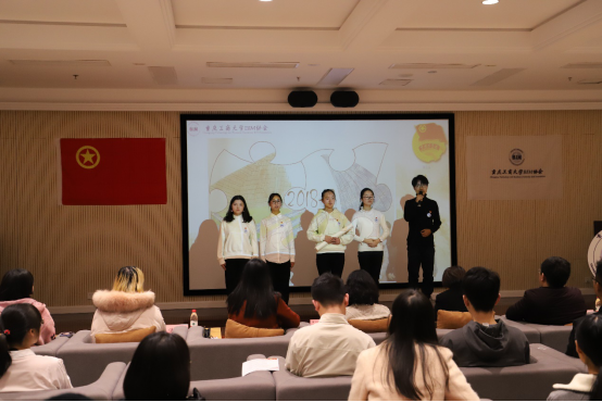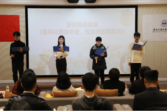 讲解结束后,由五位协会成员结合个人实际从专业学习以及响应改革开放等方面,带来以改革开放40年为主题的原创rap歌曲《渝生为国》,歌词中“40年前老邓的圈变成高房子,我们今天的flow也能有点好样子”展现了改革开放40周年房地产行业的迅速发展,同时表达了中国新青年对未来重庆,未来中国发展壮大的殷切希望,展示完毕后由5个小组分别派出代表做本次团日活动的总结朗诵并且以拼接画报时间轴(1978-2028)的方式总结本次活动的内容并将四个主题延伸到未来。