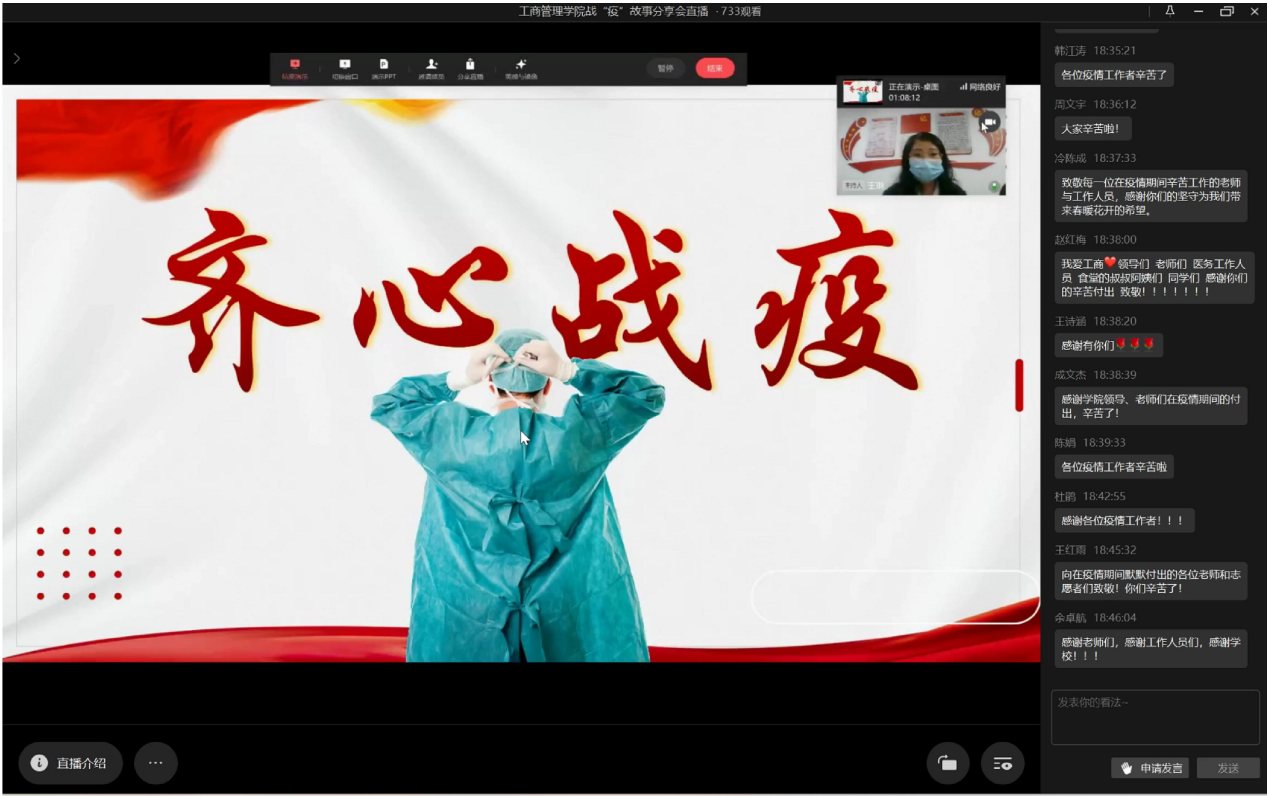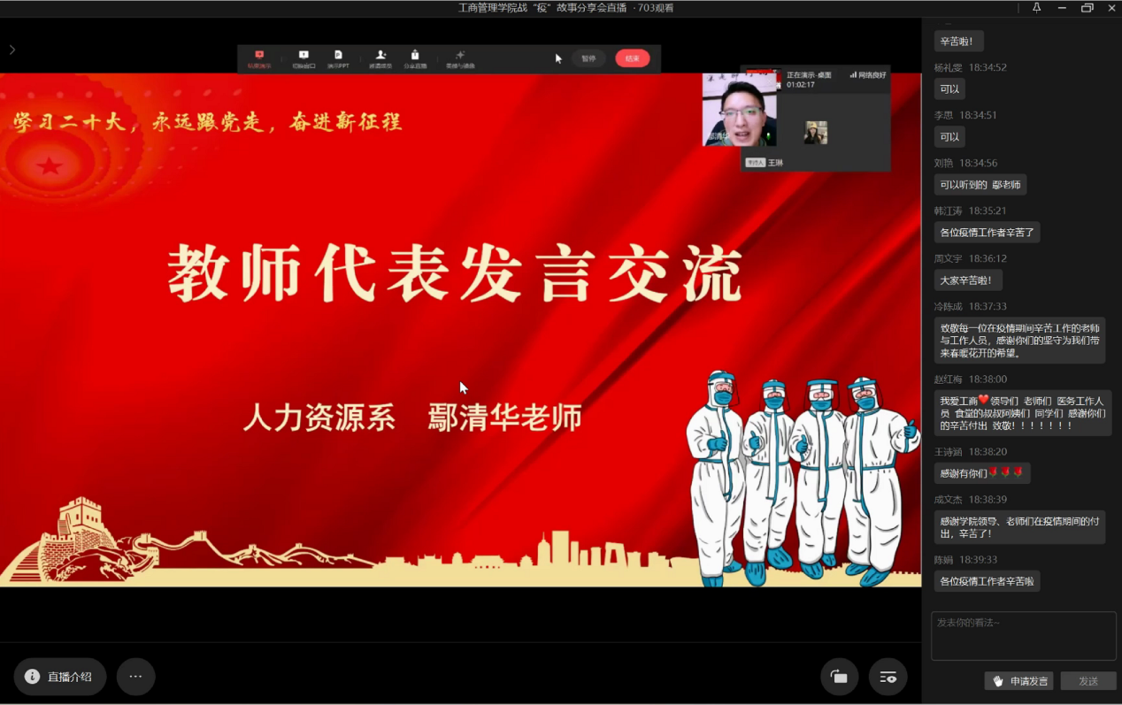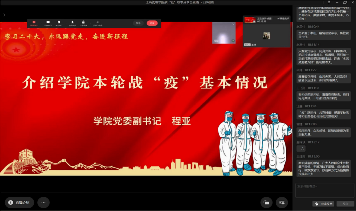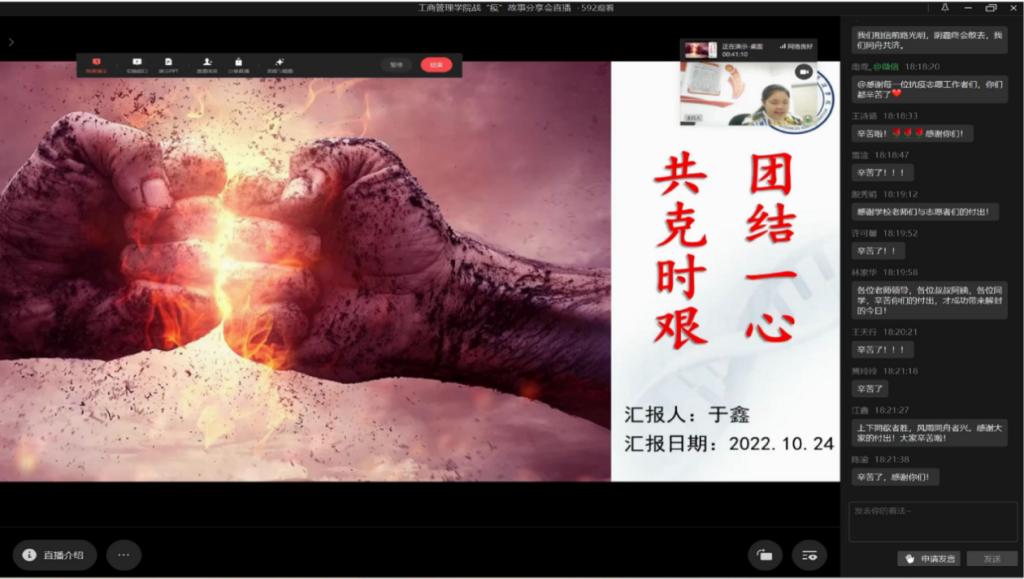 10月11日凌晨疫情突袭后,学校涌现了无数主动请缨、挺身而出的先进模范。为了引导学生向先进榜样学习,认真践行二十大精神,重庆工商大学44118太阳成tyc城集团于10月24日开展了线上战“疫”故事分享会,学院党委书记、副院长陈亚惠同志,学院党委副书记程亚同志,人力资源管理专业鄢清华老师,学院全体辅导员以及学生代表参与了活动,会议由学院学工办主任、分团委书记谭予涵同志主持。