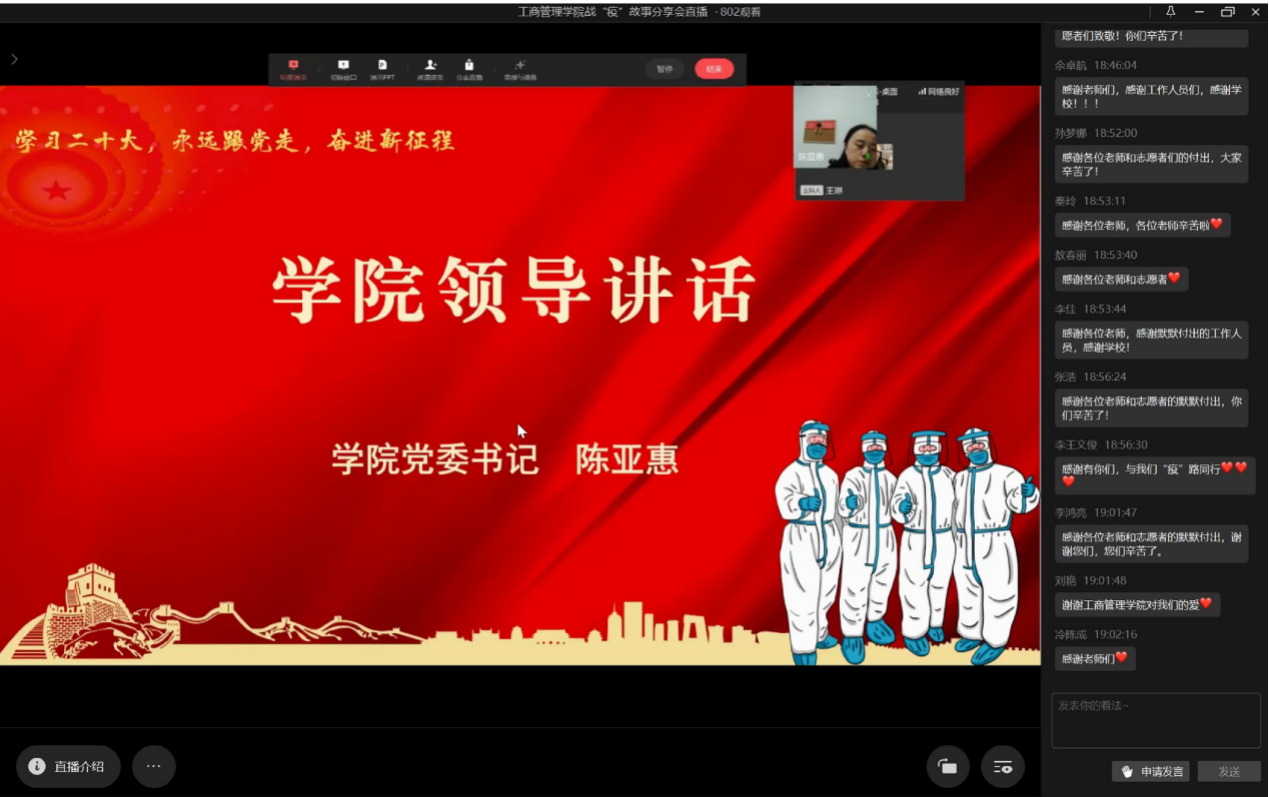 最后由学院党委书记陈亚惠讲话。陈亚惠书记首先对此次疫情中师生们的共同坚守表示了感谢,对本次战“疫”故事分享会引导学子、鼓励学子的作用表示了肯定,同时也分享自己在此次疫情的所思所感。此外,陈亚惠书记还呼吁广大青年学子要坚定不移地听党话、跟党走,怀抱梦想又脚踏实地,敢想敢为又善作善成,立志做有理想,敢担当,能吃苦,肯奋斗的新时代好青年。
