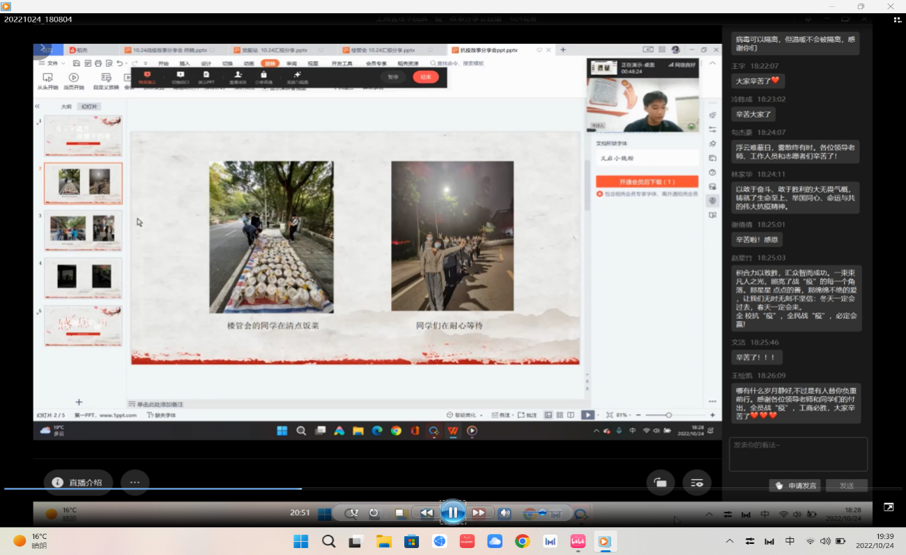 首先由学院党委副书记程亚同志发表讲话。程亚书记先向大家介绍了本轮疫情防控的基本部署情况,学院领导、专任老师、辅导员老师们闻“疫”而动,挺身而出,在送餐员、守门员等身份间无缝转换,起早贪黑积极为同学们服务,彰显着老师们的责任与担当,学生干部也积极配合老师们的工作,认真为同学们服务,发挥着学生干部的模范带头作用。