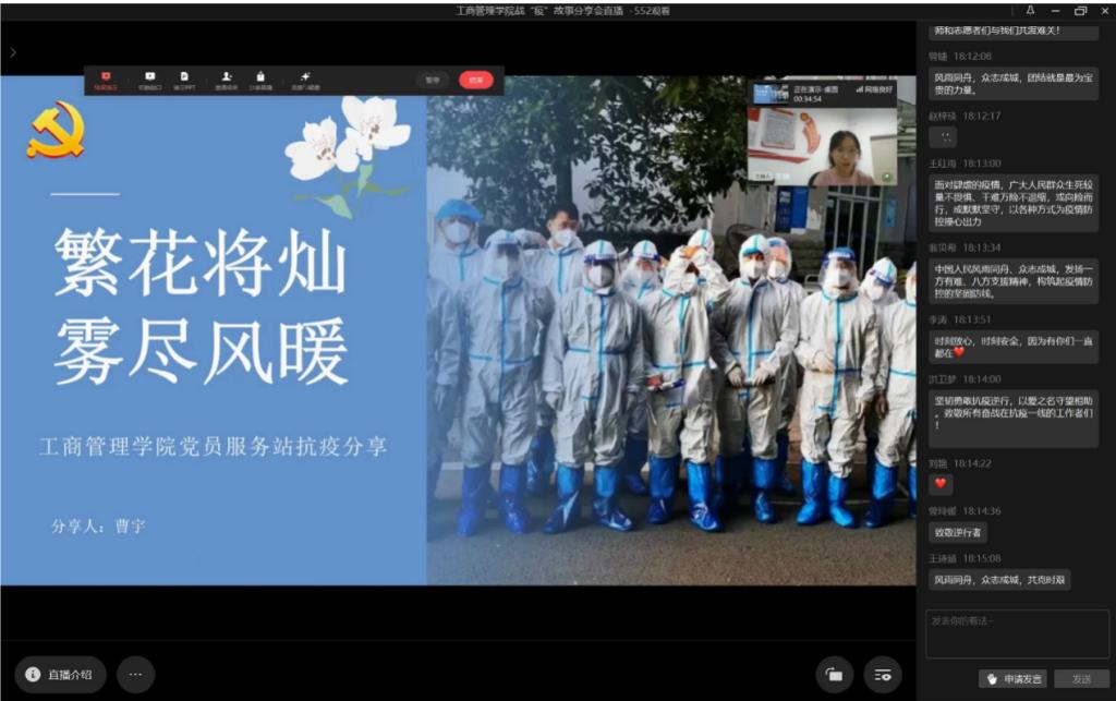 20级会展经济与管理专业曹宇和20级市场营销专业于鑫两位学生代表发言。两位同学分别作为党员服务站和楼栋的主要学生干部,从不同的角度介绍了疫情当前,学生党员干部发挥模范带头作用,挺身而出、担当使命,积极与老师们一齐为同学服务,表达了尽管抗疫工作不易,但绝不轻言放弃的精神,弘扬了学生党员干部的不怕苦、不怕累,一心为同学服务的优秀品质。