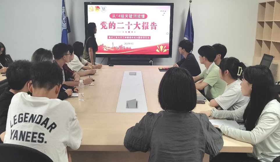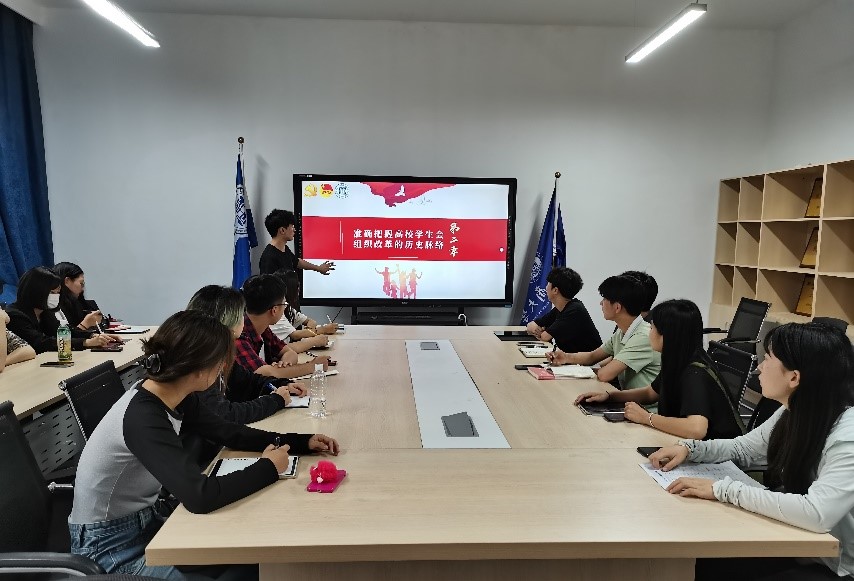 会上主要由刘艳、王凯民同学分别从14组关键词读懂党的二十大报告和《关于巩固高校学生会(研究生会)改革成果的若干措施》进行了讲解,刘艳同学在14组关键词中重点讲述了:大会主题、中国式现代化、坚持和完善“一国两制”,推进祖国统一以及推动人类命运共同体这四组关键词,王凯民同学则重点讲述了抓实高校学生会组织改革的九个主要举措,号召各位工作人员进行研究和学习,讲解深入浅出,通俗易懂,使人印象深刻。