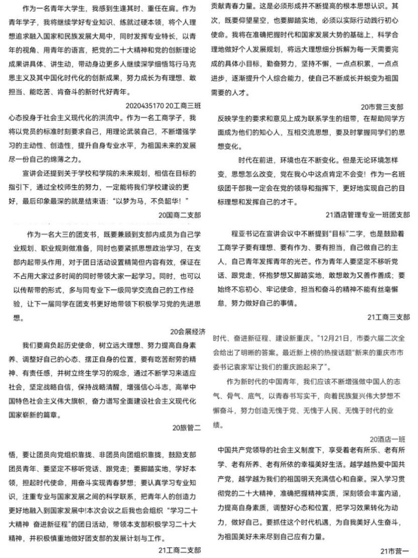 “作为青年学子,应将个人理想追求融入国家和民族发展大局中,以青年的视角、用青年的语言,把党的二十大精神和党的创新理论成果讲具体、讲生动,努力成长为有理想、敢担当、能吃苦、肯奋斗的新时代好青年”。活动期间,各党支部、党员等积极响应、主动参与,共收获心得体会100余篇。活动通过互动的方式,深入贯彻落实了党的二十大精神,加深了学生对二十大精神的领悟,进一步引导新时代的青年树立崇高理想和远大抱负。
