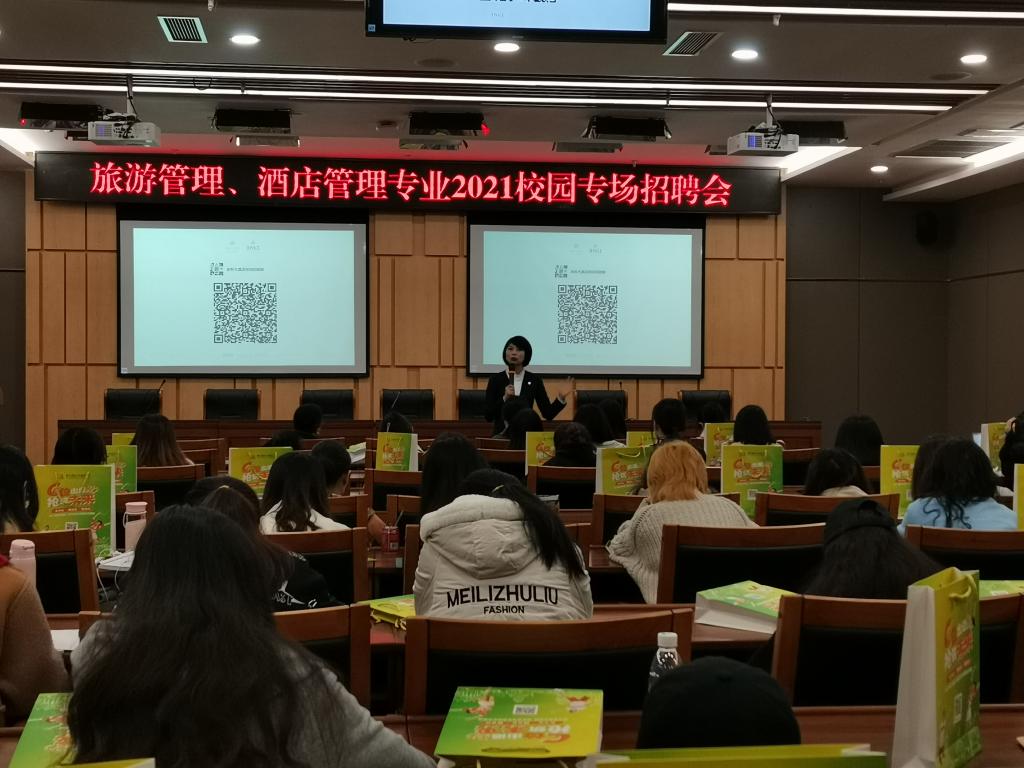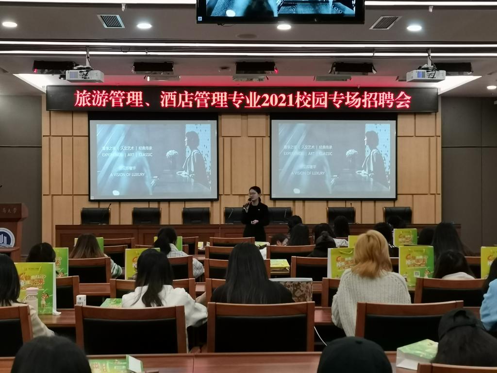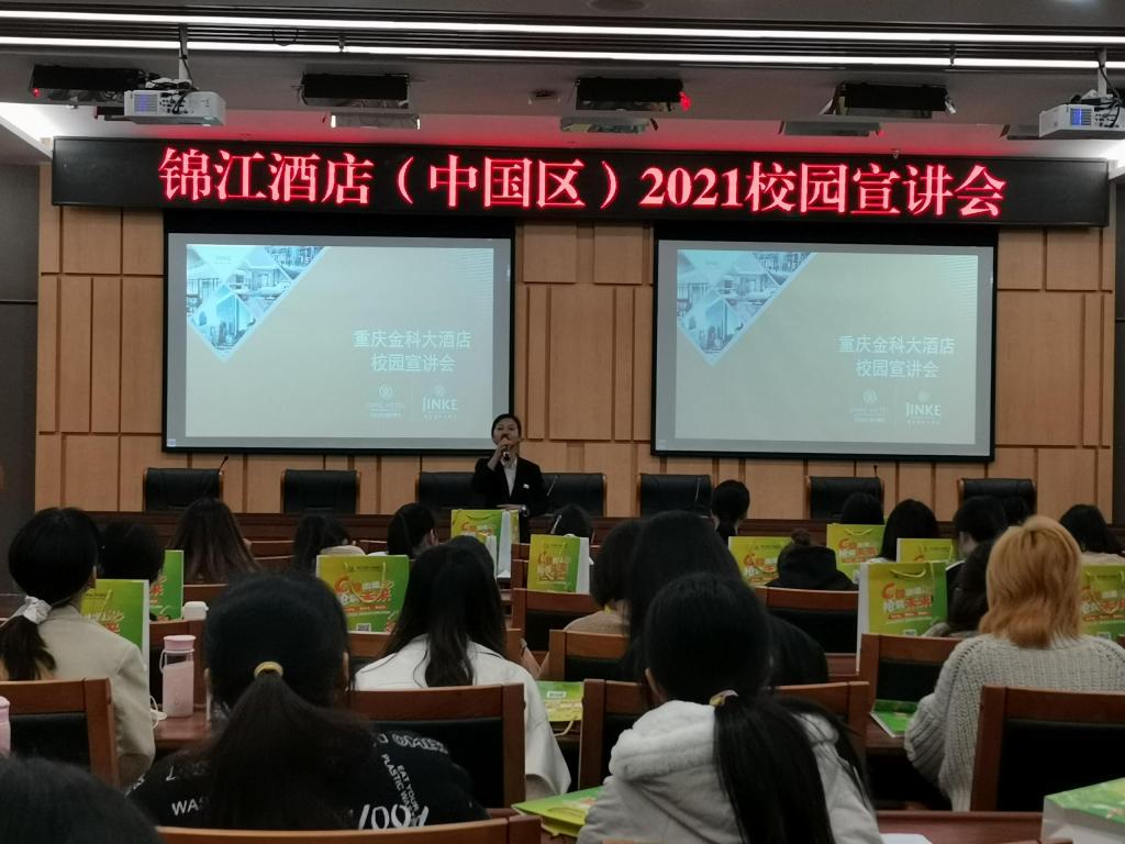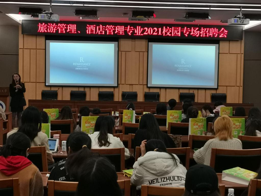 3月25日,深圳锦江酒店管理有限公司、重庆金科大酒店、成都首座万丽酒店、成都首座万豪酒店、重庆丽晶酒店受邀来到我校新图书馆一会议室开展专场宣讲会。44118太阳成tyc城集团旅游管理系主任白佳飞老师和一百三十名同学参加宣讲会。