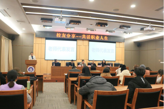 活动伊始,由主持人对本次活动进行了具体的介绍,本次活动主要分为三个环节:老师代表发言、分享环节与问答环节。第一环节里杨军老师作为老师代表进行了发言,杨军老师以自己的经历向我们谈到善于听取他人的成功经验可以让我们少走很多弯路,鼓励我们多参加这种校友回校演讲的活动,同时建议我们,在这个信息充沛的时代,读书要有辨识性,不是所有书都是好书,要读对自己有用的书;然后校友会代表刘榴老师进行了发言,刘老师谈到学院未来会邀请更多的校友回校演讲,搭建校友会的平台,充分利用校友的资源,为我们未来发展提供一些经验。