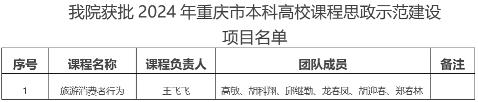 2024年11月13日,重庆市教育委员会发布了《重庆市教育委员会关于公布2024年本科高校课程思政示范建设项目名单的通知》(渝教高函〔2024〕54号),我院课程《旅游消费者行为》获批立项为重庆市2024年本科高校课程思政示范建设项目。