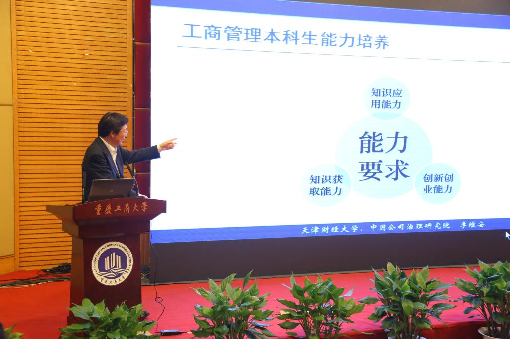 亲身参与了研究生和本科教育国标制定的长江学者、博士生导师、来自天津财经大学的李维安教授做了题为“工商管理学科发展与教学质量国家标准”的主旨发言。李教授从工商管理学科与专业发展教学质量国家标准主要特点、公司治理专业课程建设三个方面为大家解读了学科发展与国标的关系。尤其是对在人工智能和大数据背景下,体现应用性和综合性特点的工商管理学科人才培养方面发表了自己的见解,指出新时代工商管理的培养重点是人才的创新能力、社交谈判技巧和沟通能力。李教授的讲座高屋建瓴,旁征博引,语言生动诙谐,会场气氛热烈。