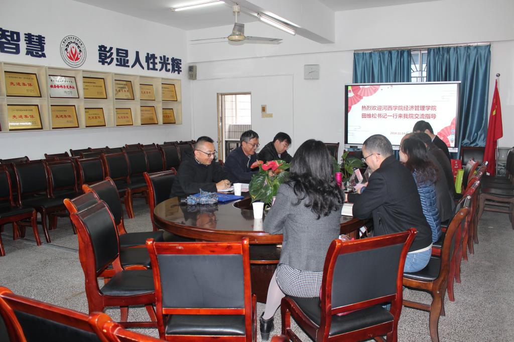 11月14日下午14:30,河西学院经济管理学院党总支田维松书记、企业管理教研室主任张晓兵、财会教研室主任赵立韦一行到我院进行调研交流,学院分党委书记、副院长王建明、副院长周莉教授、商务策划学院电子商务系主任孟伟、会计学院实验室主任石道元、管理学院工商管理系副主任饶荔、管理学院教务办副主任施桂芳参加了调研座谈会。会议由周院长主持。