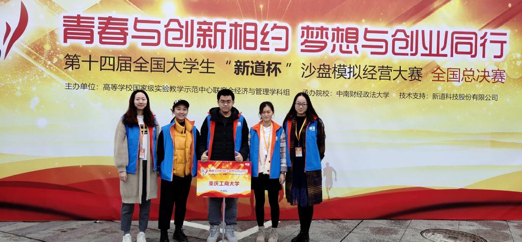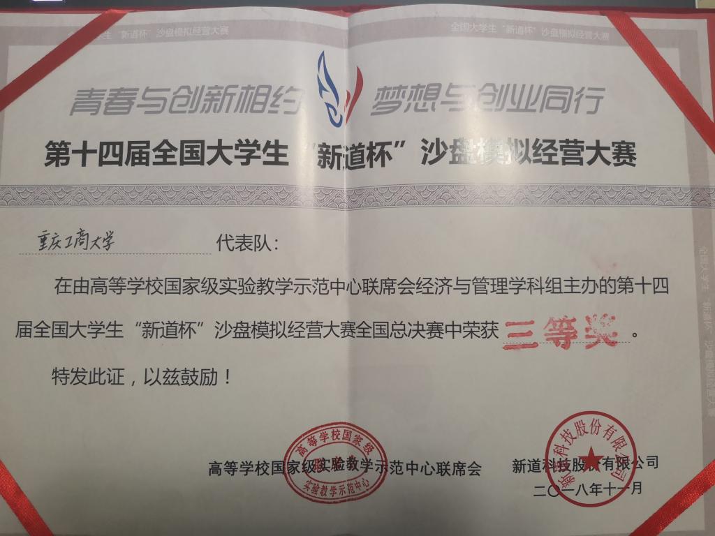 20181110日至1111日,由高等学校国家级实验教学示范中心联席会经济与管理学科组主办、中南财经政法大学承办、新道科技股份有限公司提供技术支持的第十四届全国大学生新道杯沙盘模拟经营大赛全国总决赛在中南财经政法大学隆重举行。重庆工商大学代表队参加了全国总决赛,并荣获三等奖。
