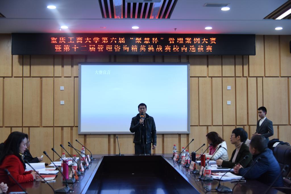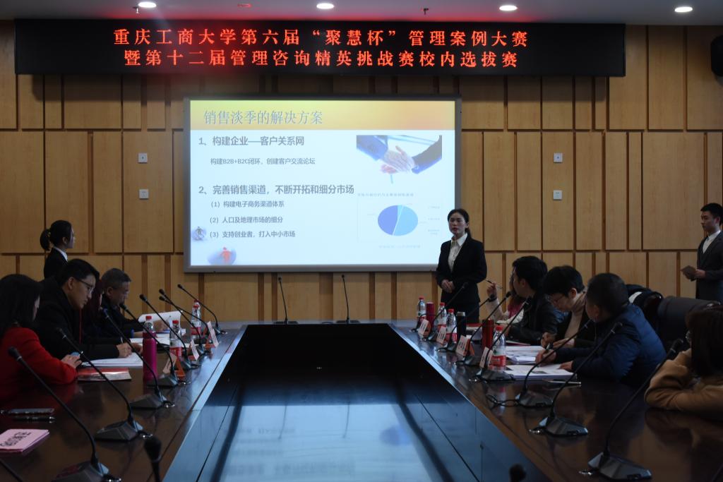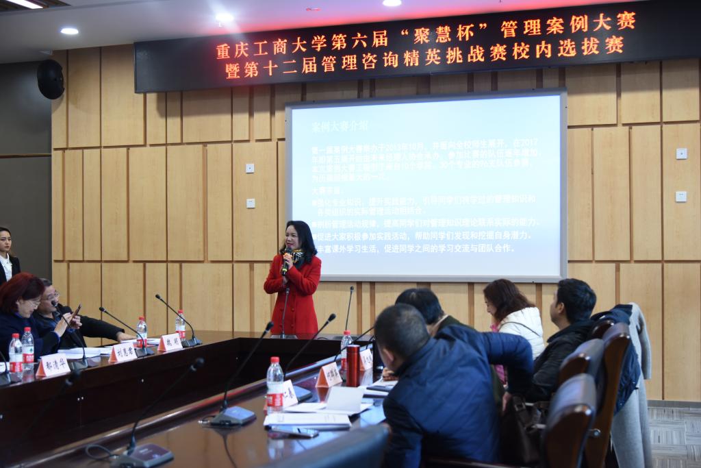 2019年3月8日下午14:00,由管理学院未来经理人协会承办的第六届“聚慧杯”管理案例大赛总决赛在图书馆第五会议室隆重举行。出席本次决赛的有重庆工商大学管理学院副院长周莉教授,管理学院工商管理系副主任饶荔副教授,担任决赛评委的是重庆聚慧食品有限公司副总经理吴旭楠先生,重庆聚慧食品有限公司物流总监何群英女士,管理学院工商管理系魏明副教授,工商管理系刘惠君副教授,人力资源管理系鄢清华老师,商务策划学院市场营销系白仁春副教授。
