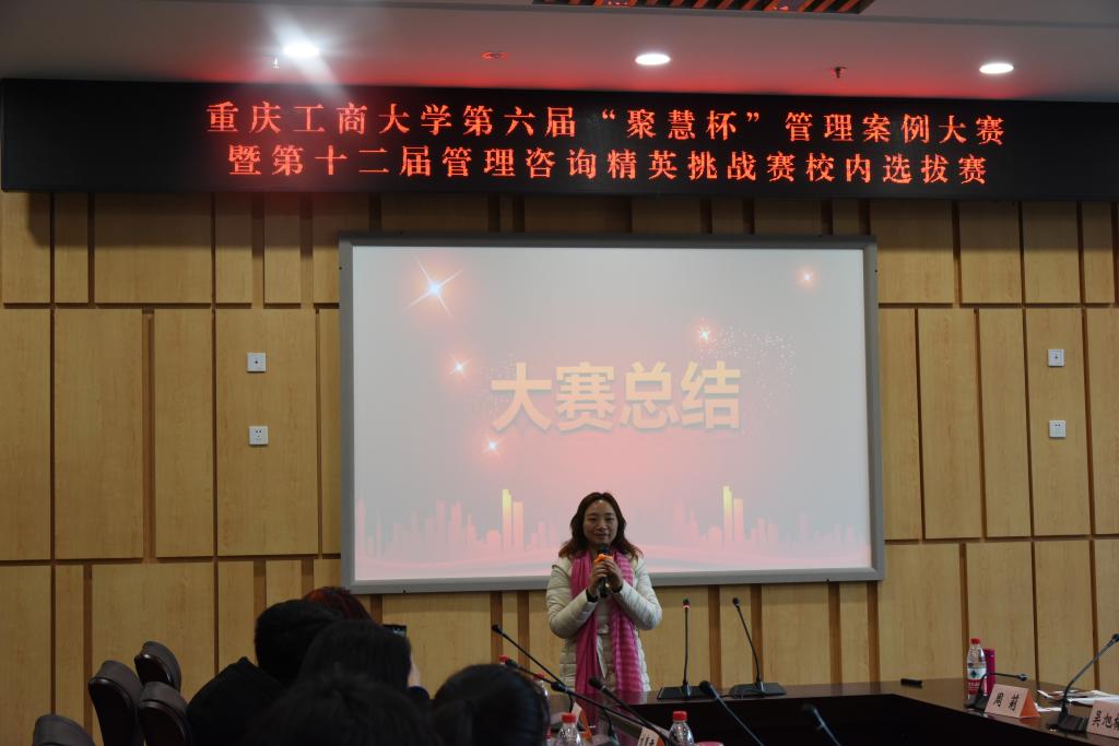 在本次比赛刚开始宣传时,便有很多同学积极踊跃的报名参加,第六届“聚慧杯”管理案例报名队伍达到了97支,成为了迄今参与人数最多的一次比赛。这次比赛之所以引人关注一方面是因为大赛影响力渐强,更是因为这是一个走进企业,了解课堂外的管理实践,开拓眼界的绝好机会。重庆聚慧食品有限公司携手重庆工商大学管理学院、未来经理人协会一起为同学们打造连接课堂与实际的桥梁,目的是为了同学们从实践中剖析管理活动规律,将学过的管理知识和实际管理活动相结合。在经过了初赛与复赛的层层选拔后,共有七支队伍走向决赛舞台。他们凭借制作精良的PPT,对重庆聚慧食品有限公司管理独到的见解以及从容应答评委的犀利问题,使评委们赞口不绝。在肯定参赛报告后评委们针对不同主题的报告给出了具体的建议,使参赛队伍受益匪浅。在参赛队伍全部展示完毕后,刘惠君副教授对本次决赛进行点评,称管理案例大赛是一个非常有意义的活动,这是同学们相互学习,相互成长的过程,要从企业的角度研究问题,做任何事情都要从实际出发。之后聚慧公司何群英总监对此大赛也做出了点评,称赞同学们的案例完成得非常出色,并希望赛后能与同学们探讨交流管理案例的解决方案。最后,周莉院长对本次大赛进行了总结,对重庆聚慧食品有限公司表达了谢意,感谢公司为此次比赛提供机会和素材并给予支持,也希望能拓宽与公司合作的范围,同时希望管理案例大赛在以后的比赛中能够吸引更多的同学参与,培养出应用型、复合型、创新型人才,实现学校总体人才培养目标。