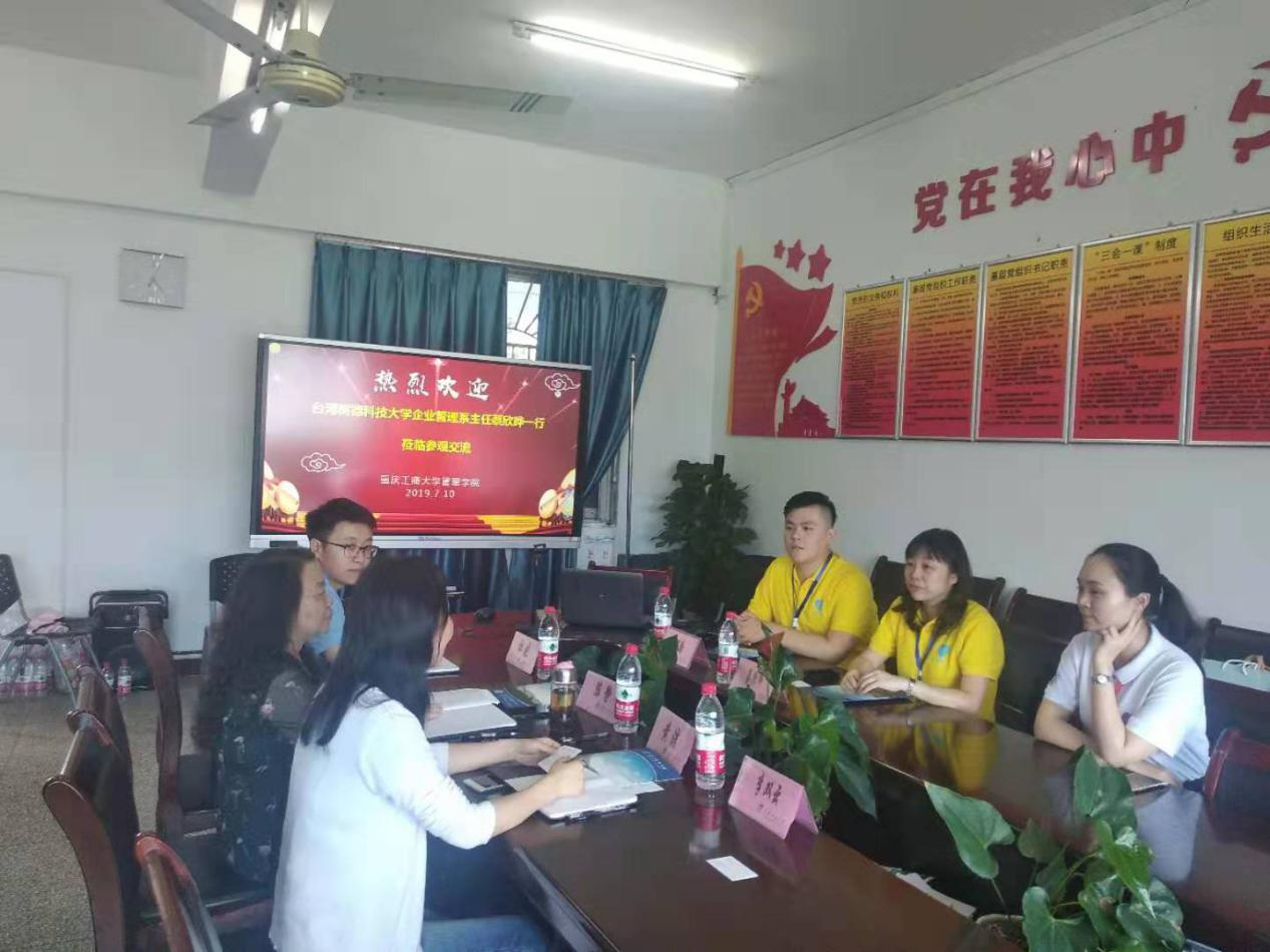 7月10日下午2:00,2:00,台湾树德科技大学管理学院企业管理系主任蔡欣晔一行2人在国际合作与交流处(港澳台事务办公室)杜晓老师的陪同下,莅临我院就师生交换学习、学术交流合作等事宜进行交流。工商管理系主任陈静教授、项目合作办公室主任黄洁博士及学院教学秘书李双云老师参加交流会。