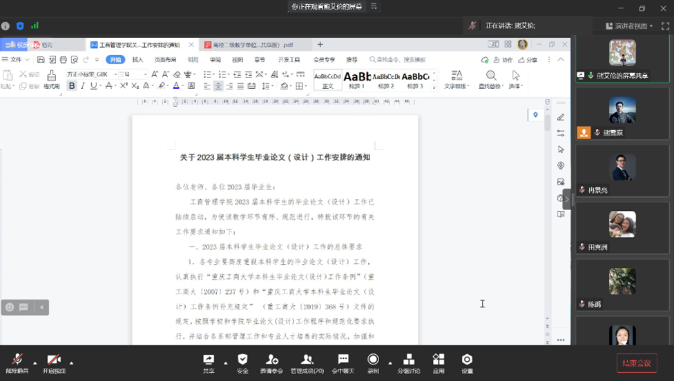 会上,熊艾伦结合学校、学院关于2023届本科学生毕业论文(设计)工作安排,对毕业论文的选题、指导和相关时间安排做了介绍,并提醒各位老师:一是毕业论文选题要符合专业方向,反映企业或社会实际需求。二加强对学生的指导,及时回应学生的疑惑及困难,保留好指导痕迹。最后,各位老师针对23届本科毕业论文的指导与撰写进行了交流。