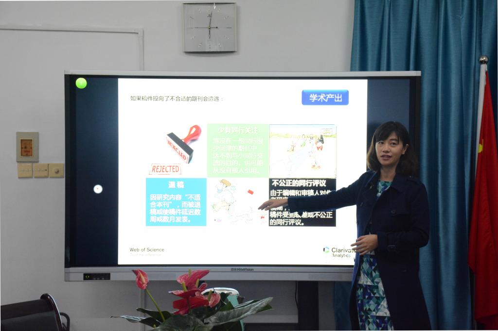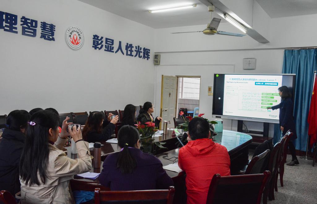 首先,黄院长向在座的老师和研究生介绍了郭杨专家,并阐明开展此次讲座目的。随即专家郭杨女士开始讲座,她以人文科学研究的国际视角向在场学者、研究生介绍到:因为社会科学研究国际化是全球化时代的必然要求,则人文科学研究需要“国际化”。紧接着她介绍了关于Web of science及引文索引的相关应用及好处,耐心地介绍了其主要内容以及操作方法。后又以类比的方法将做企业与找课题作对比,生动形象地说明了应如何经营人文社科研究。最后以如何选择将论文投到恰当的期刊,如何对经管类期刊影响力进行评价为话题为本次讲座画上了圆满的句号。