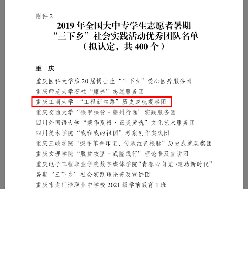 近日,2019年全国大中专学生志愿者暑期“三下乡”社会实践活动总结通报结果及各项成果遴选活动结果公示,我校BIM协会“工程新丝路”历史成就观察团荣获2019年全国大中专学生志愿者暑期“三下乡”社会实践活动优秀团队称号。