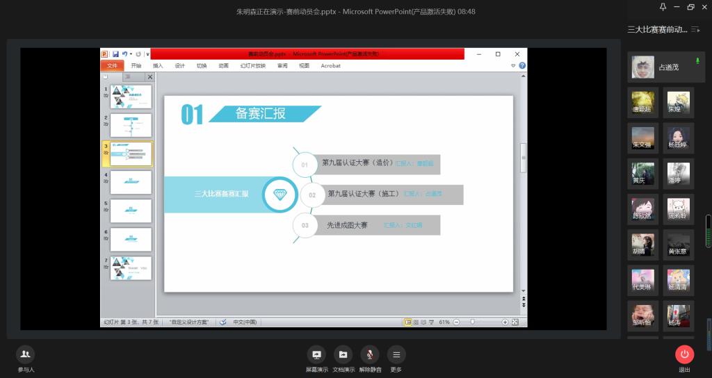 会议第一项,由大赛负责人唐颖超、占道茂、文红娟同学分别针对第九届认证大赛造价组、第九届认证大赛施工组、先进成图大赛的准备和训练情况进行汇报。唐颖超同学从培训期间的问题、校内赛成绩方面对第九届认证大赛造价组进行了汇报。占道茂同学对第九届认证大赛施工组参赛人员名单、训练计划、作业情况、校内赛成绩等方面做了简单汇报。文红娟同学从手绘完成情况、CAD软件作业完成情况对先进成图大赛进行了分析。