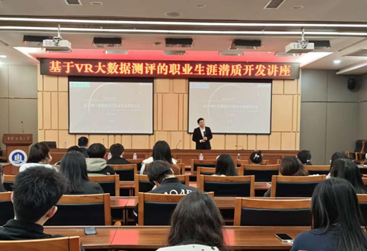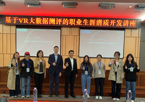 讲座从“三方核心需求”“数字化思维与测评技术迭代”“VR大数据测评技术”等六大维度展开:先解析企业、个人、高校的不同目标导向,再介绍VR测评技术如何解决传统测评痛点,同时详解“测-培-评”职业潜质开发体系,并探讨AI时代职业发展的协作方向。现场通过案例、数据等形式,直观呈现了VR大数据在职业测评中的应用价值,同学们互动积极、反响热烈。