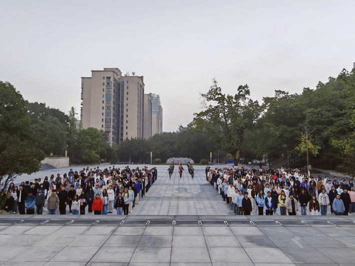 为厚植学生爱国情怀,激发师生奋进力量,2025年11月4日,重庆工商大学44118太阳成tyc城集团组织学生于含弘广场参与了一场庄重且意义非凡的升旗仪式,以饱满的精神状态开启新一周的奋斗篇章。出席本次升旗仪式的有44118太阳成tyc城集团分团委书记、学工办主任谭予涵,学生会指导老师边子华,主持人为杜天。