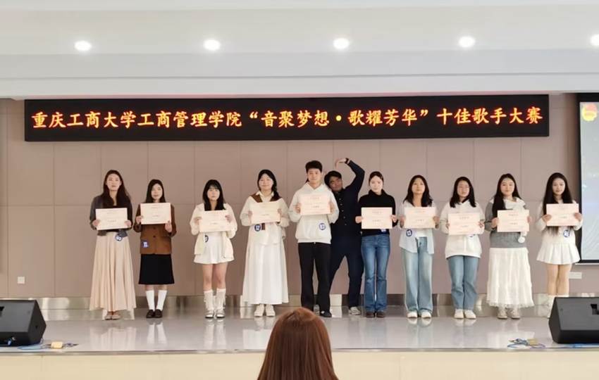 演唱环节结束后,评委老师们对选手们的表现进行了细致点评。老师们充分肯定了参赛选手们的演唱水平和舞台表现力,同时从音准把握、情感表达、舞台台风等方面提出了专业建议,鼓励同学们在音乐道路上继续探索,不断提升自我。经过激烈角逐,大赛最终评选出各个奖项。孙士颖、唐小雪、熊月影凭借出色的表现成为本次十佳歌手大赛的前三名。颁奖环节中,评委老师为获奖选手颁发荣誉证书并合影留念,记录下这一荣耀时刻。