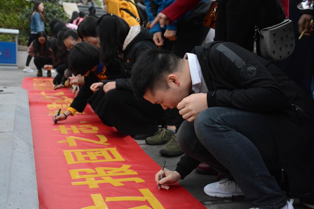 最后,同学们齐唱校歌,在斗志昂扬、激情澎湃的歌声中本次升旗仪式圆满落幕。同学们纷纷自发在立报国之志,增建国之才,践爱国之行”的横幅上签名留念。今朝我们眺望着国旗冉冉升起,耳畔回荡着气壮山河的国歌,希望管院的学子们能不忘初心,做一个无愧于时代的新青年!
