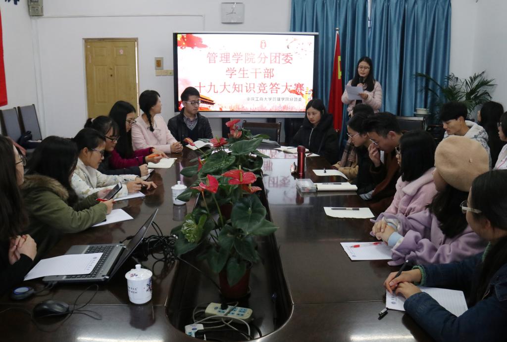 为了进一步学习贯彻党的十九大精神,12月14日中午,管理学院分团委在南岸校区明德楼3021开展了学生干部十九大知识竞答大赛。本次竞赛由管理学院爱心桥·义工志愿者协会副会长邱珂主持,学院分团委书记何祖润莅临现场为分团委学生会和义工志愿者协会的主要学生干部做十九大精神宣讲。