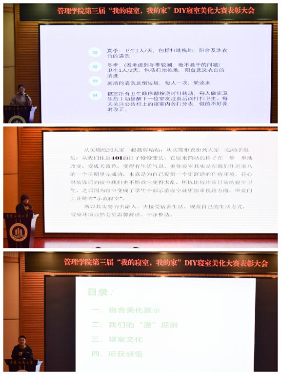 获奖寝室南八401寝室、北二B3006寝室、北五2007寝室的三位同学代表就如何打造寝室文化,养成良好生活习惯,打造和谐寝室氛围进行了经验分享交流。