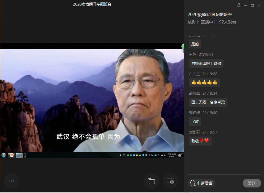 随后直播视频中,伴随着深情款款的歌声,传来“90后”白衣天使在抗疫前线含泪剪掉长发的画面,也传来声情并茂的诗歌朗诵《钟南山是一种精神》,同学们被这些同龄的“光头卫士”感动着,也被钟南山院士的浩然大气和崇高精神震撼着,大家都目不转睛、神情凝重地盯着画面,任由眼泪在眼眶里打转,任由眼泪悄然流下……