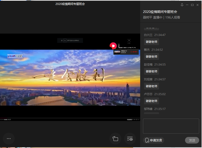聂树平老师主持本次班会,他简单说明了本次线上直播班会的目的、内容和意义。解放军军乐团出品的抗疫主题进行曲《胜利召唤》便出现在直播画面,那一幅幅感人的画面,一句句激昂奋进的歌词,尽显子弟兵的铁血担当,让所有同学心潮澎湃。“向前方,山的那边是战场;号角响,跟我上;向前方,水的这边是亲人;子弟兵,使命扛肩上;向前方,我们和时间赛跑;一切努力,都为了生命至上……这是人间大爱光芒!雄壮威武的歌声在耳边环绕,热血报国之志在心中久久激荡。