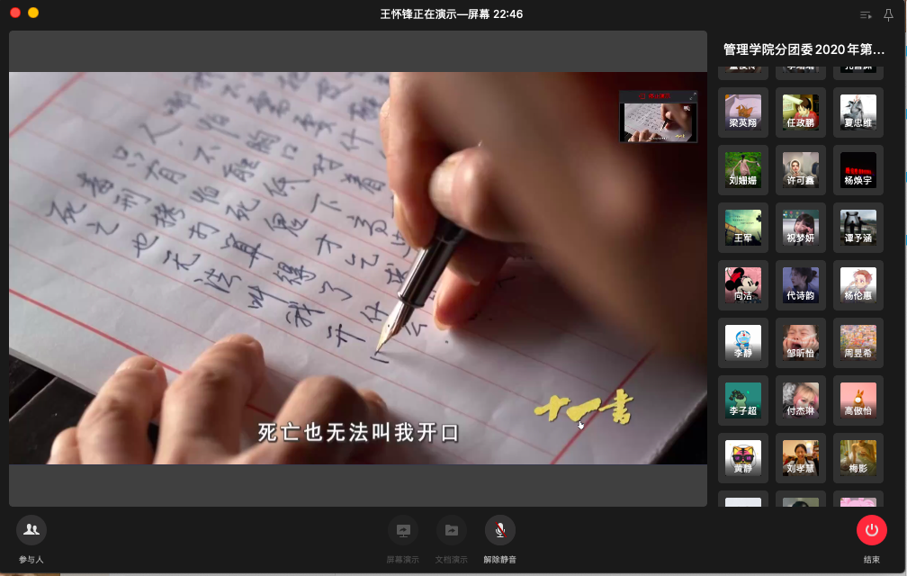 第二阶段,全体参会学生干部在屏幕前跟唱共青团团歌。随后是视频教学环节,会议播放的《战“疫”故事》与《见证初心和使命的十一书》两则短片,让学生干部体会到抗疫英雄们的艰辛付出与当时的共产党人用生命和鲜血铸就的信念和忠诚,学习到在未来的工作和生活中也应当坚守初心与使命的精神。
