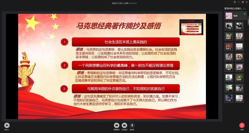会议最后进行的是“寻找身边的马克思”汇报展示,五个小组用精心制作的PPT分享了马克思著作中部分经典语句的赏析,展示了马克思主义对于现实生活的重要影响和意义。此次汇报展示也向学生干部传达了学习马克思主义思想、跟党的旗帜走有助于培养更高的思想维度以及打破枷锁勇敢创新的重要思想。