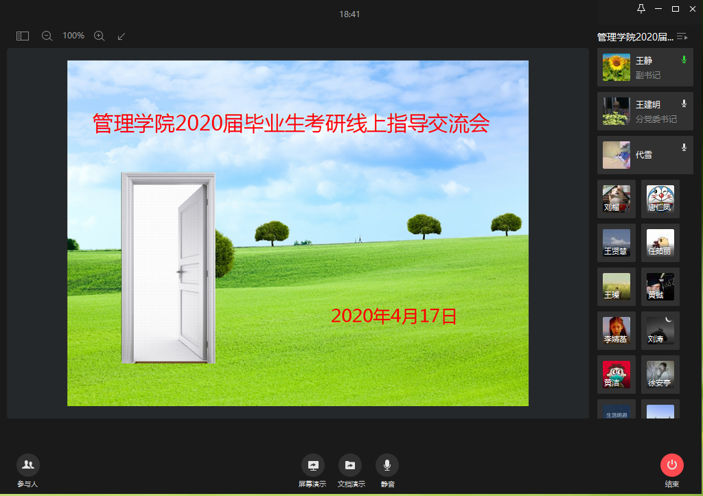 2020年4月14日,教育部公布了2020年考研国家线和复试安排,为了帮助考研上线同学复试准备得更加充分,管理学院于2020年4月17日上午8:30,利用企业微信平台召开了2020届毕业生考研线上指导交流会,全体院领导、系主任、就业联络员、毕业班辅导员和58名考研上线同学参会,会议由管理学院分党委副书记、纪委书记王静主持。