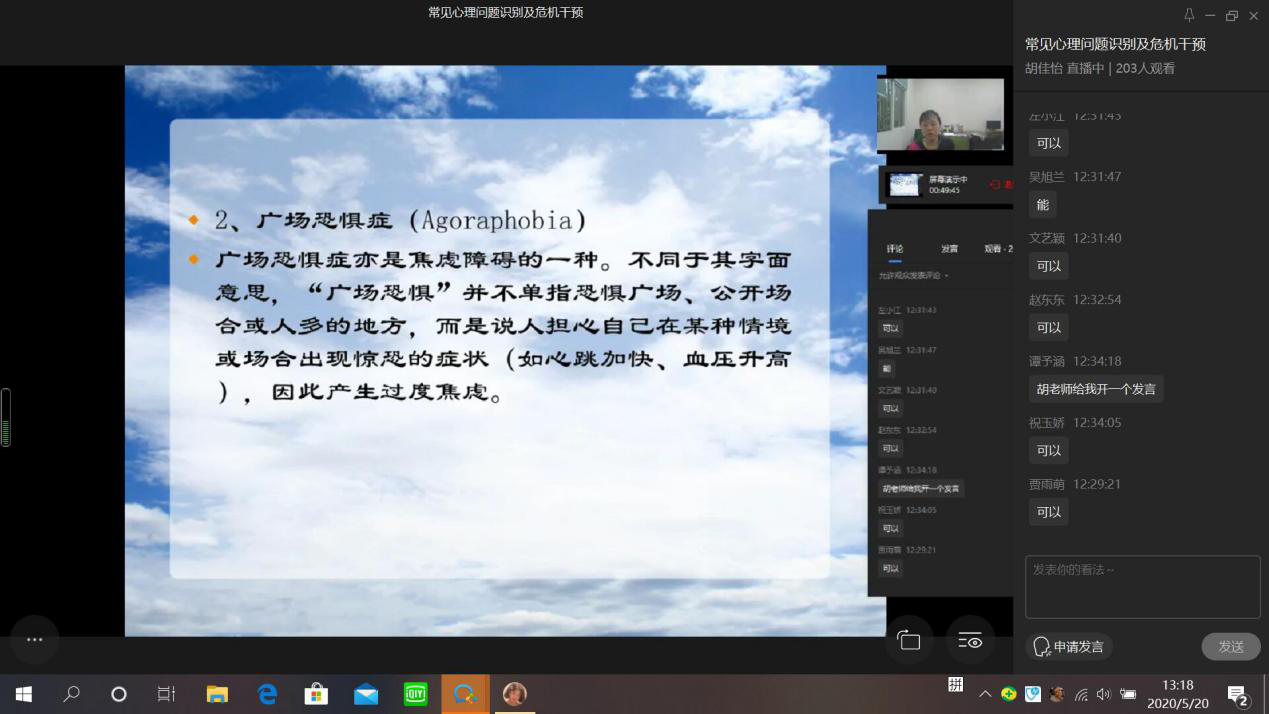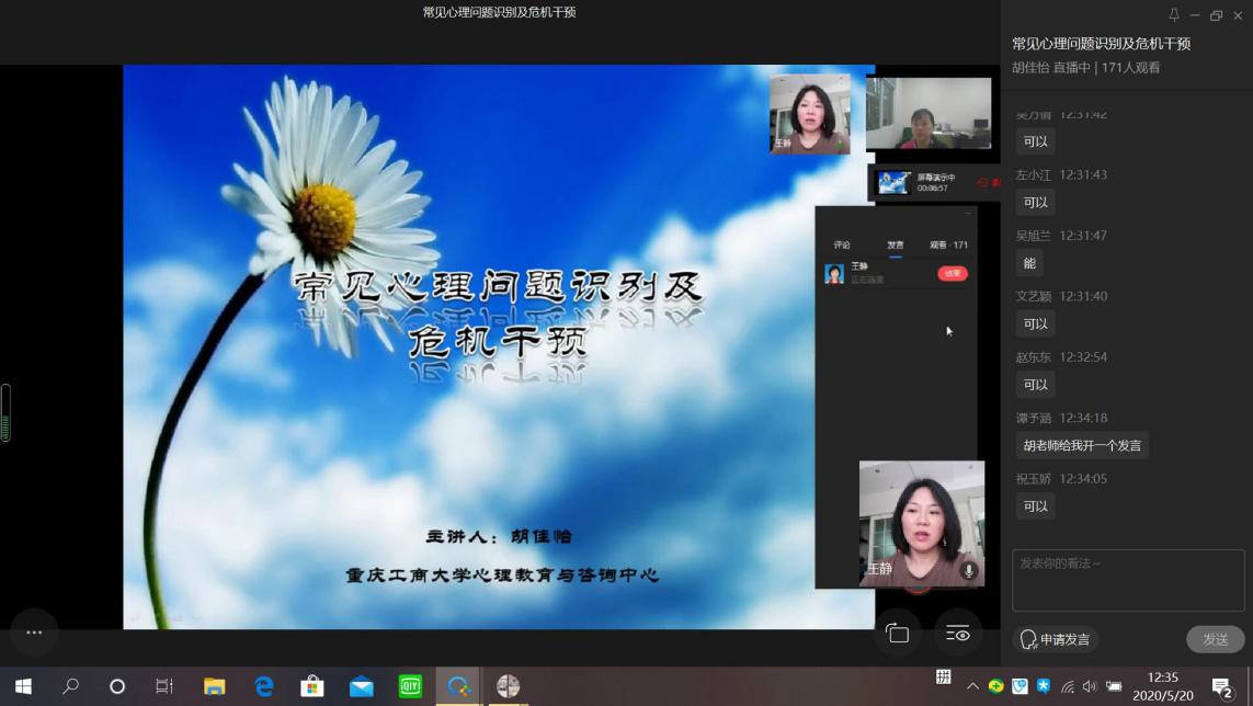 为了有效帮助同学们在疫情期间正确面对出现的心理障碍,积极调适心理问题,保持良好的心理状态, 2020年5月20日12:30管理学院借助企业微信平台举行以“常见心理问题识别及干预”为主题的心理健康知识讲座,特别邀请重庆工商大学心理健康咨询中心主任胡佳怡老师为同学们传授心理健康知识。管理学院分党委副书记、纪委书记王静,学生工作办公室副主任、分团委副书记谭予涵,2017级和2018级各班的心理委员、各寝室室长参加了此次讲座。本次讲座由谭予涵老师主持。