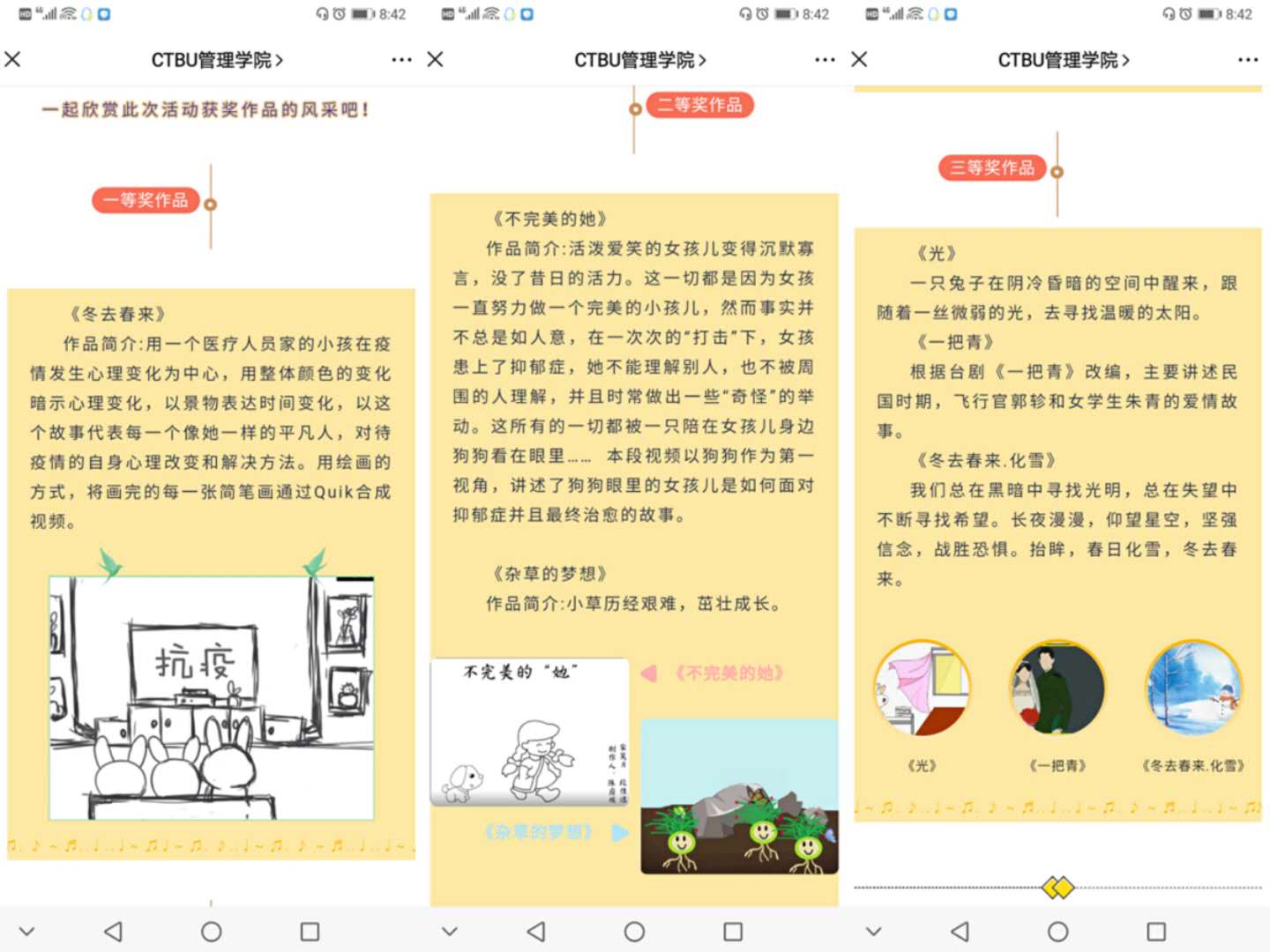 本次心理Flash视频制作活动以“心印暖阳 ‘帧’显阳光”为主题,面向全校学生广泛征集作品,受到了各学院学生的广泛关注,大家纷纷提交精心制作的作品,积极响应参与活动。经过激烈的角逐,《冬去春来》《光》《一把青》等十个稿件脱颖而出,赢得了难能可贵的决赛机会。在整合初赛得分、评委打分及线上投票多个指标过后,作品《冬去春来》最终以77.53的分数夺魁。该作品展示了疫情期间居家生活由冬天到春天的转变,表达了对宅家生活疫情阴霾之下冬日的展望与春天的绽放。作品《不完美的她》《杂草的梦想》分别以75.80、74.33的分数位列第二、第三。而《光》《一把青》《冬去春来·化雪》获得了三等奖。至此,经历了1个月的重庆工商大学第十六届“心印暖阳 “帧”显阳光”心理flash视频制作比赛活动圆满结束。