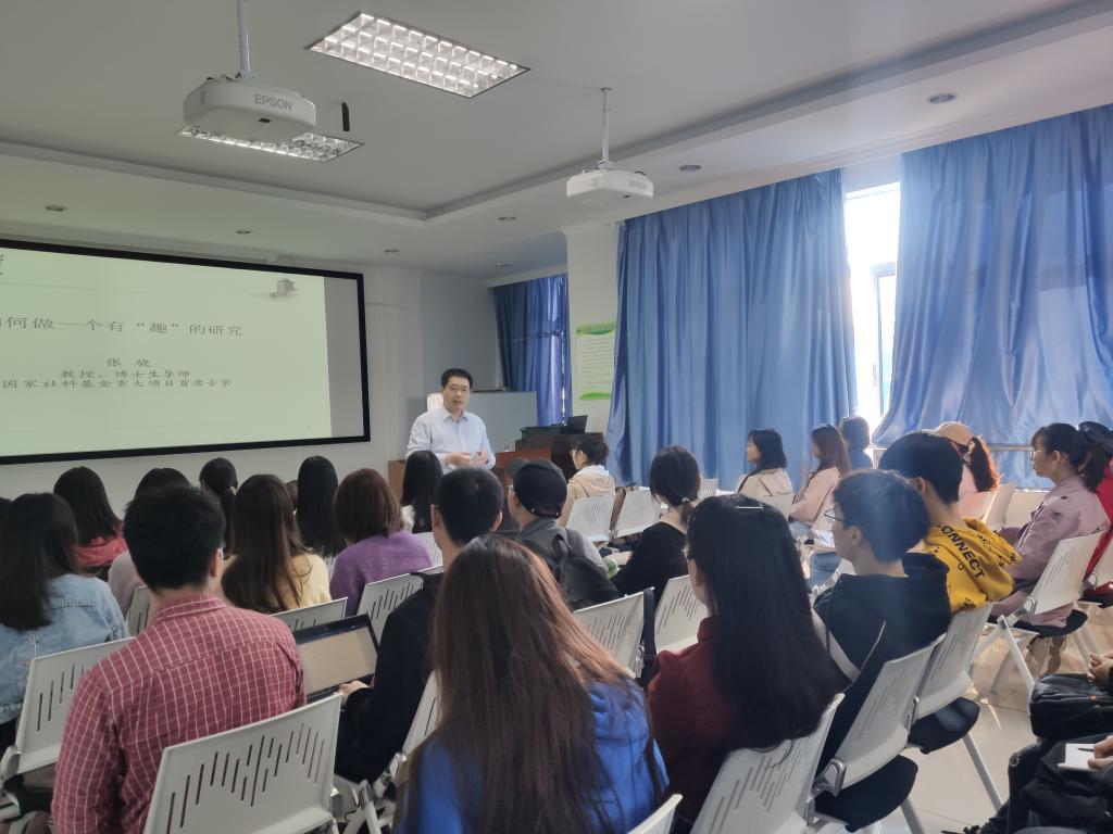 张骁教授以“如何做一个有‘趣’的研究”为题,解读了什么是有“趣”的研究,解释了做有“趣”的研究为何重要,以及做有“趣”的研究需要有理论、现象与画面感等。接着,张教授分享了自己的三个研究,用学生们易于理解的方式讲解了idea产生背景、基本故事情节、从中得到的启示等,让学生们真正体会到了何为有“趣”的研究。
