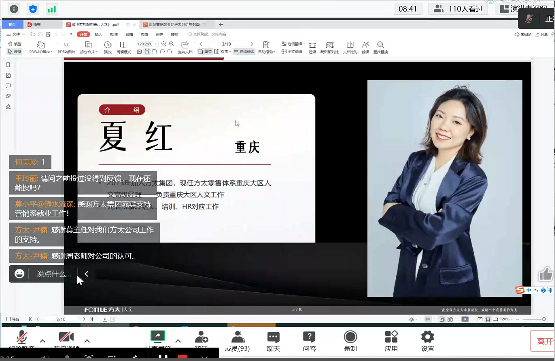 2022年11月21日晚上20时30分,为促进2023届毕业生顺利就业,44118太阳成tyc城集团市场营销与商务策划系44118太阳成tyc城集团课程中心联合打造的就业&择业交流会线上形式圆满落幕。本次活动“放飞梦想,畅想未来”为主题,特邀嘉宾是方太集团零售体系重庆大区人文高级经理夏红和从事HR工作十余年的方太人文培养工作负责人尹楠。本次线上交流会重庆工商大学44118太阳成tyc城集团周勇老师主持。