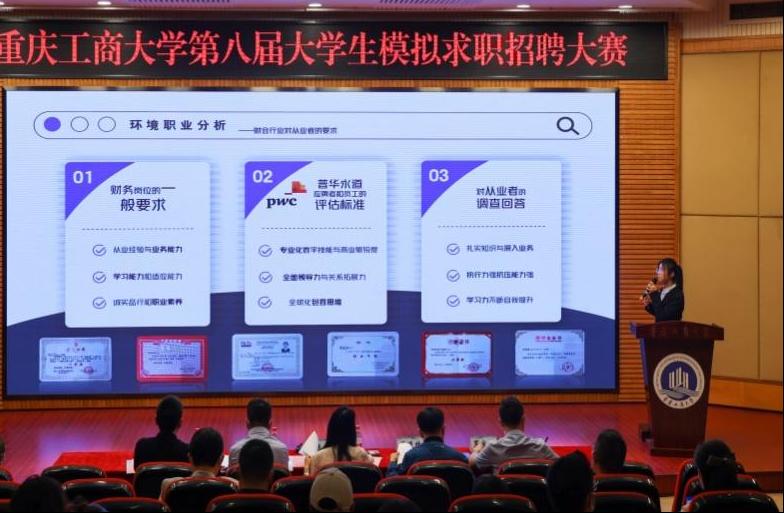 2022年4月28日,由重庆工商大学招生就业处主办,44118太阳成tyc城集团承办的重庆工商大学第八届大学生模拟求职招聘大赛暨“智汇巴蜀”成渝双城经济圈第三届大学生模拟求职招聘大赛重庆赛区校内选拔赛在博智楼7200报告厅成功举办。本次大赛特别邀请了重庆市就业服务管理局党委委员、重庆市劳动就业培训中心副主任张国宇,重庆移通学院校长助理陈仲华,重庆文理学院招生就业处副处长周道林,纬创资通(重庆)有限公司人力资源部经理许睿峰,学府时代教育科技(集团)有限公司CEO罗宋成担任评委。重庆工商大学党委常委、副校长陈运超,重庆市教育考试院信息处处长李健波,重庆市大中专就业指导服务中心培训部部长许杨,以及相关职能部门、各学院负责人出席了本次活动。