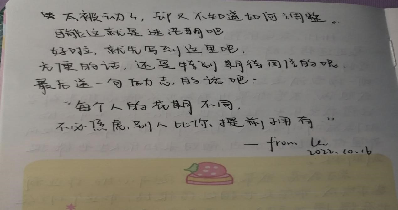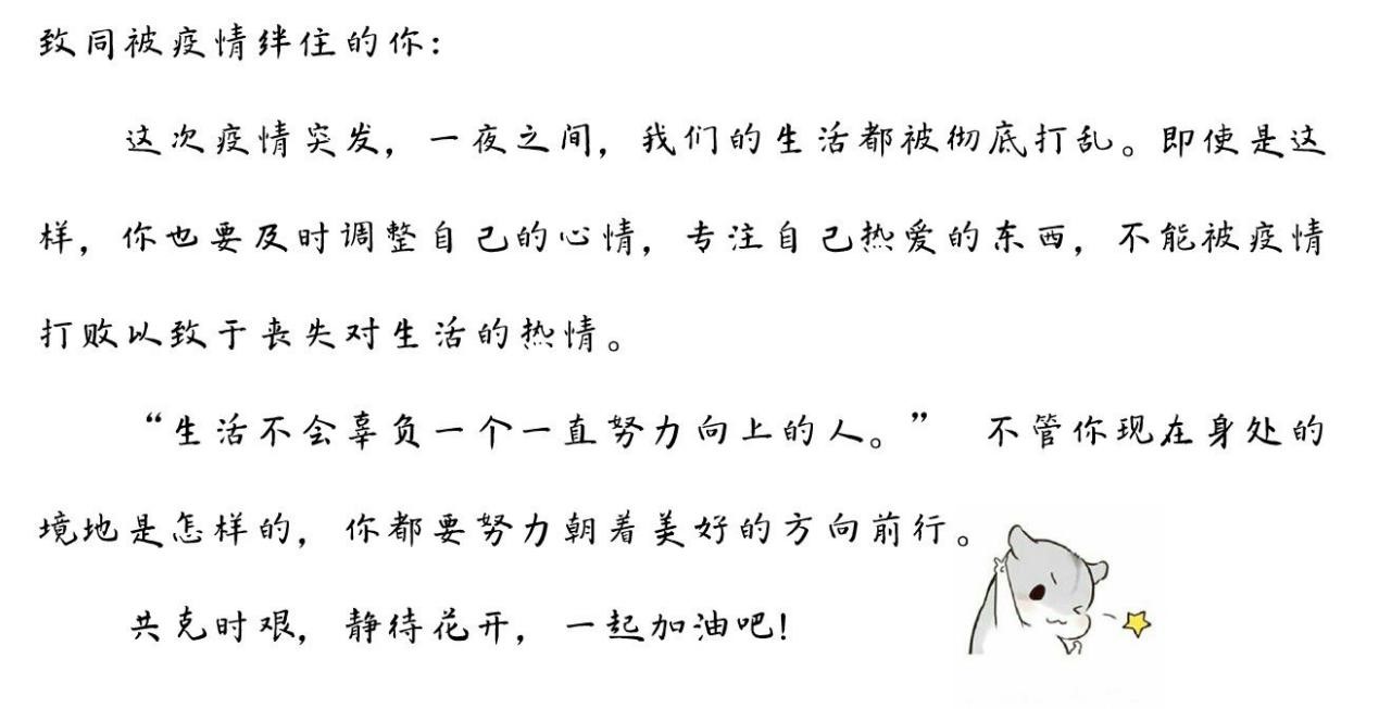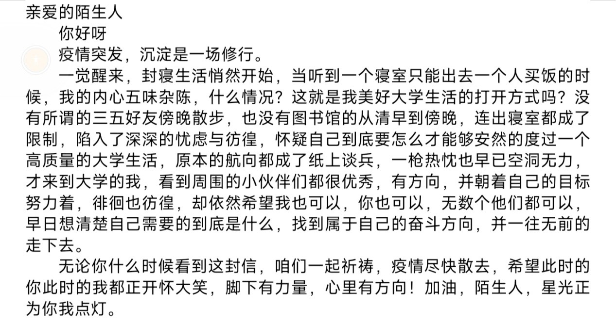 2021级旅游管理二班的彭飞同学表示:“这次心理活动,使我在紧张的疫情局势下的心理压力得到了缓解,封校的负面情绪通过写信的方式得到了释放。同时,这次活动让我收到了一位同学的认真回信,感觉自己的心声得到了回应,感谢这次契机让我遇到了可以倾述心事的知己。”