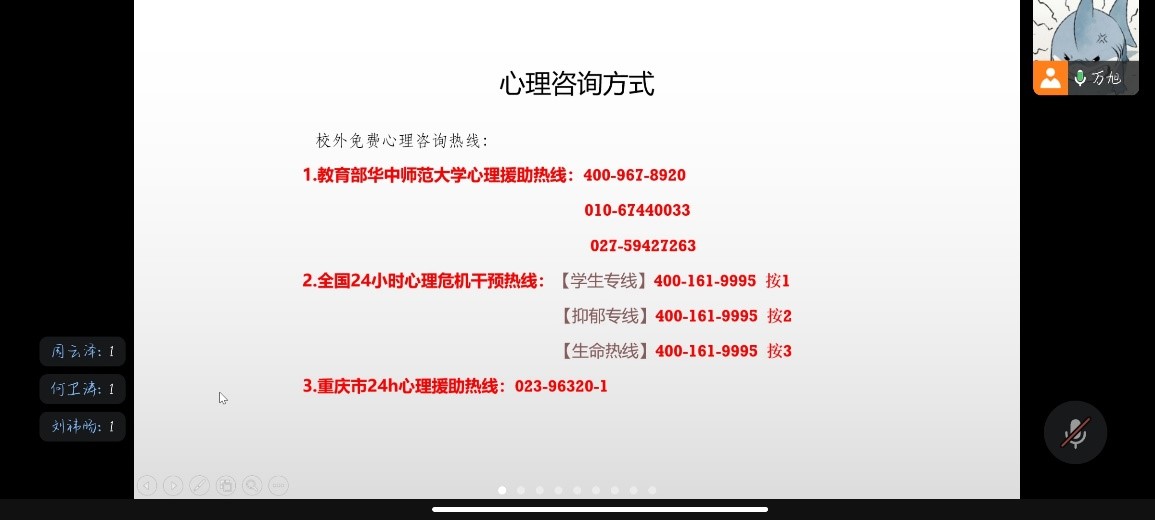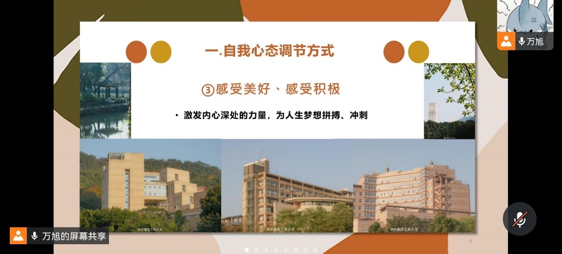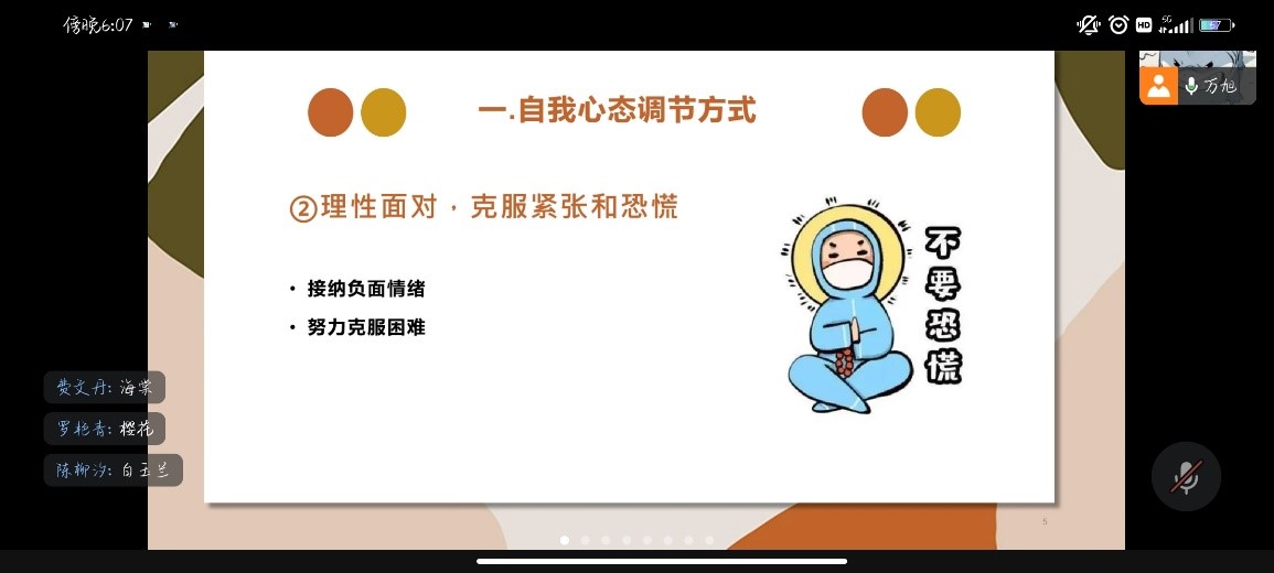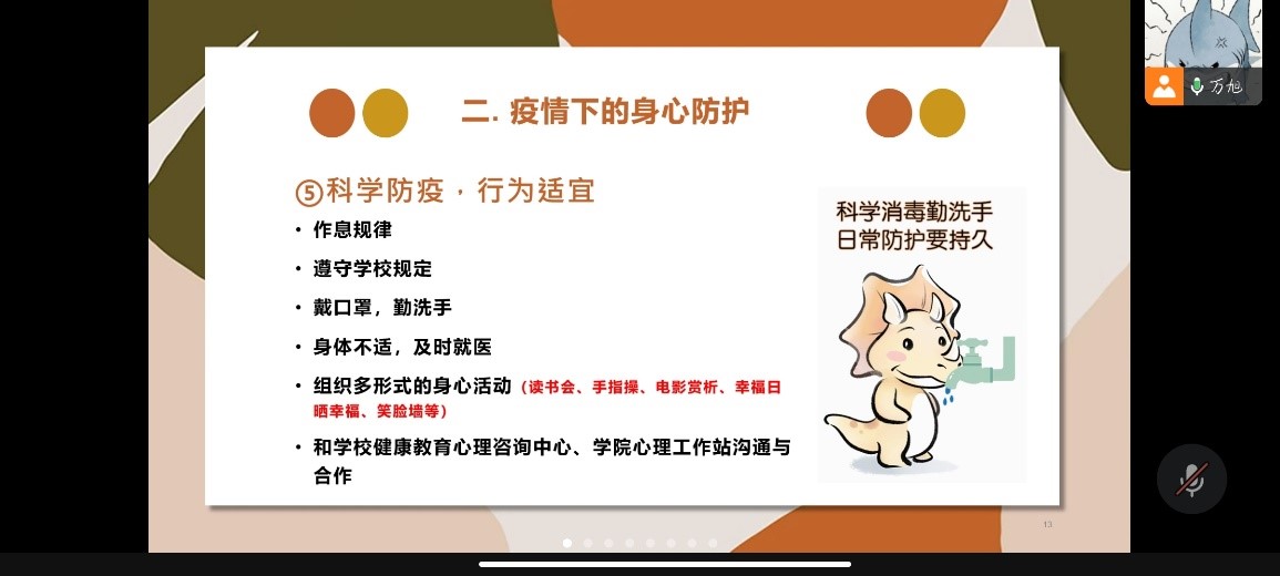 活动中,主讲人就疫情反复之下,心理委员自我心态调节方法、疫情下的身心防护、心理健康工作开展途径三个方面为心理委员进行了相关介绍。学院心理委员认真观看了直播并积极地参与到了直播的互动中,分享了各自疫情下的心理状态。在此次活动中,心理委员们加深了对疫情环境下自身身心状态调节方法的了解,也明确了如何在疫情下给予同辈们更多的帮扶,携手共渡难关。