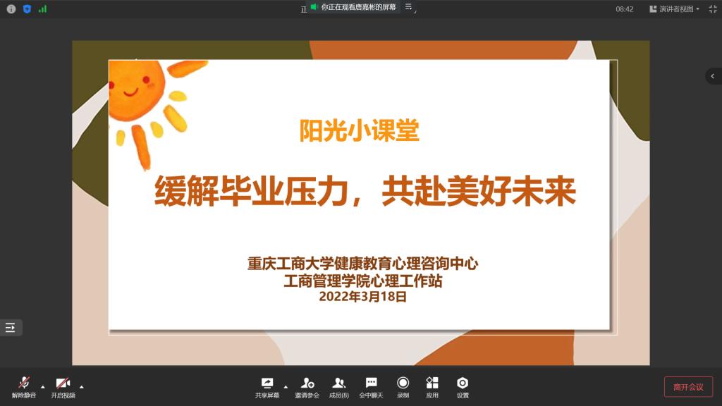 2022年3月18日,周五晚上19:00,44118太阳成tyc城集团心理工作站针对大四毕业开展以“缓解毕业压力,共赴美好未来”这主题的阳光小课堂线上讲座活动。本次活动由44118太阳成tyc城集团心理工作站指导老师,国家二级心理咨询师周明老师主讲,学院大四20余名毕业生积极参与讲座。