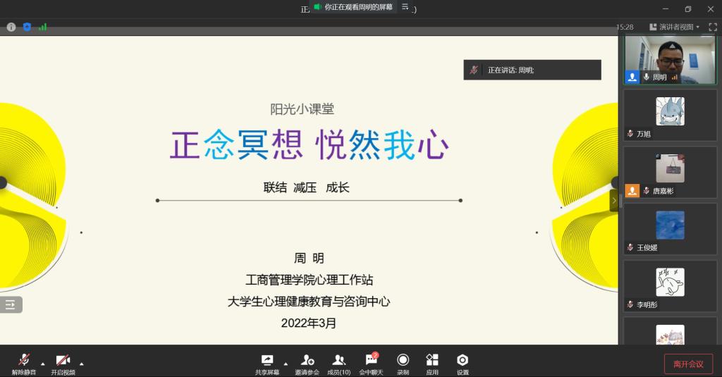 讲座中,心理工作站指导老师周明老师以“联结、减压、成长”为引导,进行了以“正念冥想,悦然我心”为主题的讲解,并动员同学们投入到正念冥想的线上实践中来。参加本次活动的大四同学认真地倾听了相关内容,积极参与活动的讨论,学习了正念冥想的相关知识,缓解了毕业带来的种种压力。