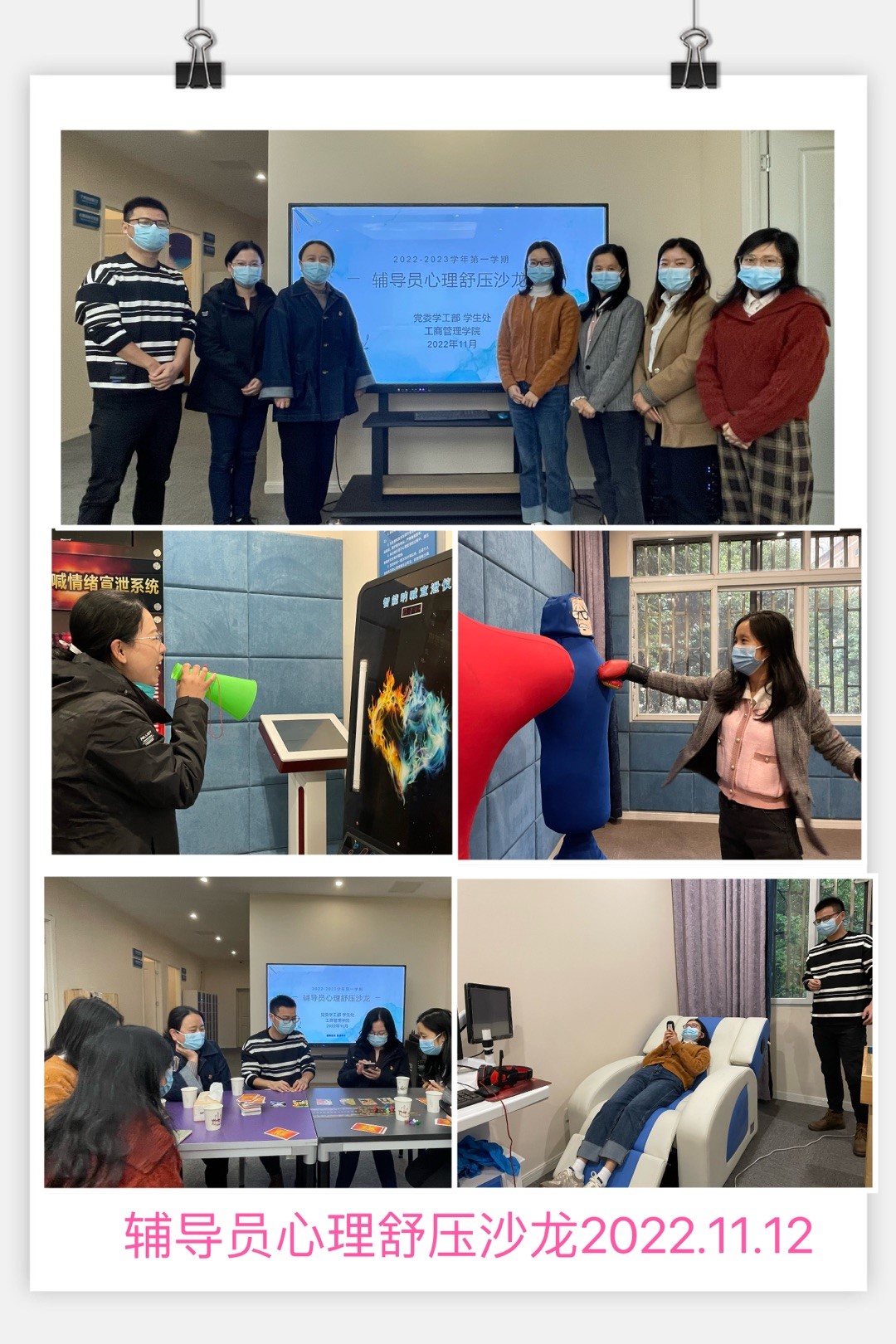 开学以来,面对疫情防控严峻形势,全体辅导员心系学生、深入一线,严格执行学院相关决定与举措,认真开展思想政治教育和各项管理服务工作,为维护校园安全稳定做出了应有贡献,但同时他们也面临着高负荷的工作压力与挑战。为加强特殊时期辅导员队伍心理建设和对辅导员的人文关怀,44118太阳成tyc城集团联动心理中心,于11月12日在学校心理中心开展了一期辅导员心理舒压沙龙活动。此次活动中,辅导员们实地体验心理中心“身心减压仓”、“呐喊宣泄仪”等多种减压设备,为持续学生工作减压、赋能。