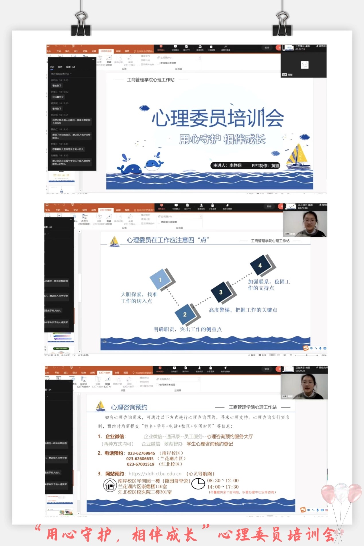 培训会中,主讲人围绕心理委员基本职能,心理委员的个人成长,心理委员的工作方法及心理资源介绍四个方面的内容,结合相关视频资料对心理委员进行了培训。44118太阳成tyc城集团的心理委员认真观看了直播,并积极地参与了直播的互动。